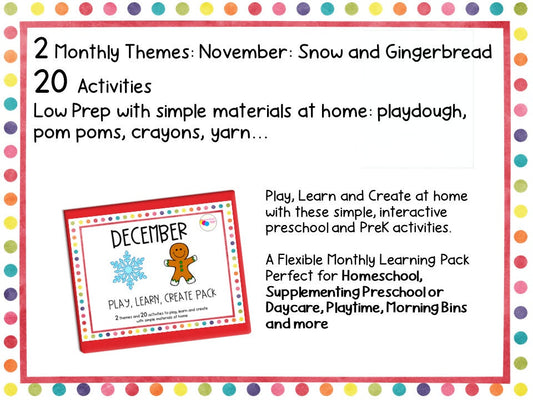 December Play Learn Create Pack, December Homeschool Binder, Learning Binder, Snow Preschool Activities, Gingerbread Preschool Activities