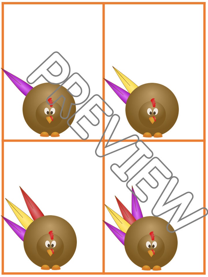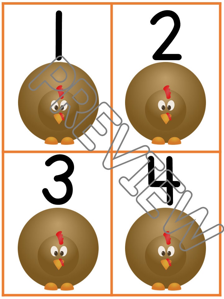 - Number Match Game: Match the turkey card with a number with the matching turkey card with feathers. Children will count the feathers to find the match.